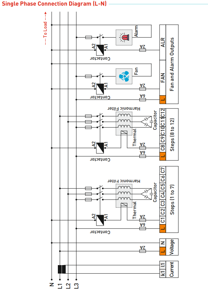 12 steps Single-phase connection Power factor controller for power factor control in networks with symmetrical loads (TENSE)