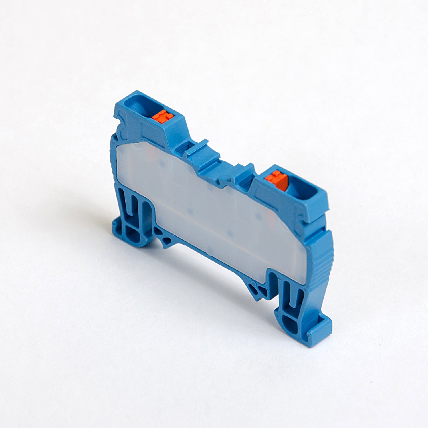 Veerrailkoppeling / DIN-railklem 2-draads, intrekbaar contact, blauw, ONKA, made in Turkey.
